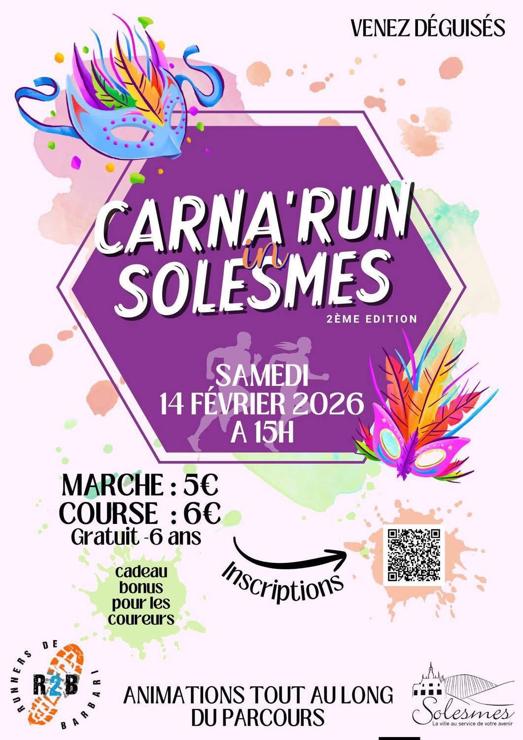 Carna'run in Solesmes– 2e édition Un parcours unique de 6 km, accessible à tous :En courant : course chronométréeEn marchant : balade conviviale, non chronométrée Déguisements vivement encouragés !Événement familial : parcours accessible aux poussettes et aux chiens tenus en laisse.Gratuit pour les enfants de moins de 6 ans, mais inscription obligatoire.Ambiance festive, surprises et