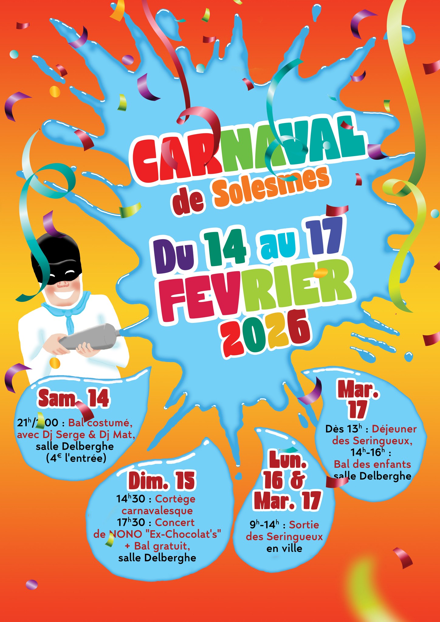 🎉 Carnaval de Solesmes 2026 : 4 jours de fête du 14 au 17 février ! Le Carnaval de Solesmes 2026 revient en force du 14 au 17 février 2026 pour quatre jours de festivités, de musique et d’animations pour petits et grands. Organisé à la salle Delberghe et en centre-ville, cet événement incontournable promet