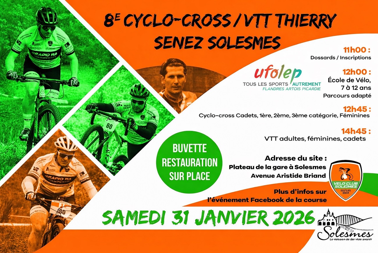 Plateau de la gare Avenue Aristide Briand, Solesmes, FranceLes 31 janvier et 1er février 2026, la ville de Solesmes (Nord) devient le rendez-vous incontournable des passionnés de vélo avec le 8e Cyclo-Cross / VTT Thierry Senez, organisé par le Vélo Club de Solesmes. Cet événement majeur du calendrier cycliste est ouvert à tous et sert de support officiel au Championnat du Nord FSGT